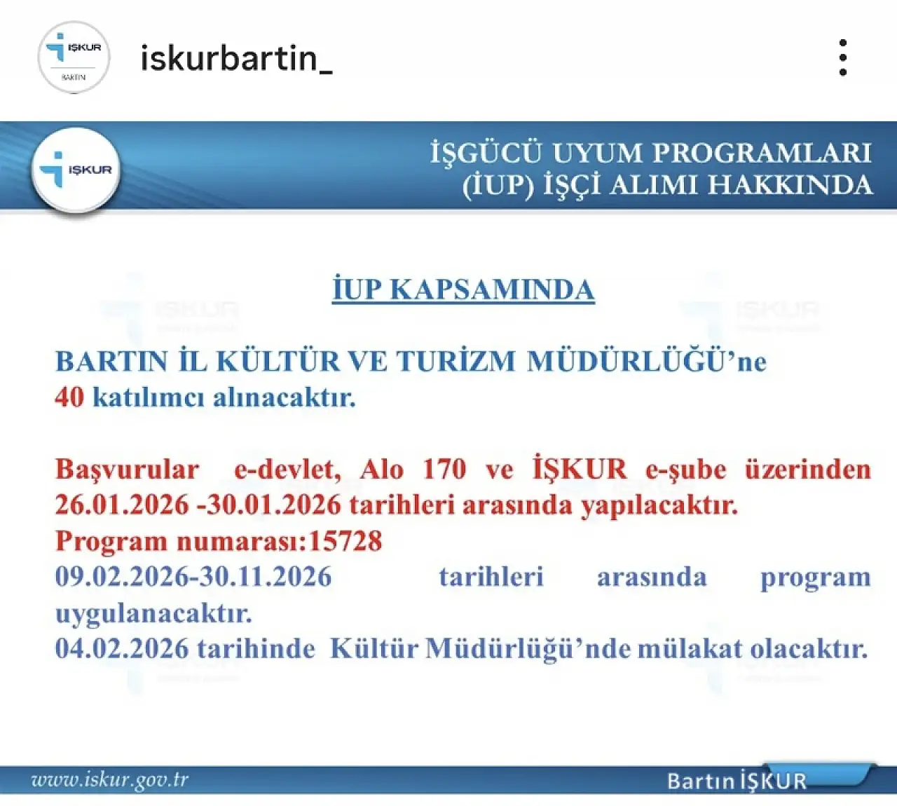 İşgücü Uyum Programı (İUP) kapsamında, Bartın İl Kültür ve Turizm Müdürlüğü bünyesinde görevlendirilmek üzere 40 katılımcı alınacağı duyuruldu.