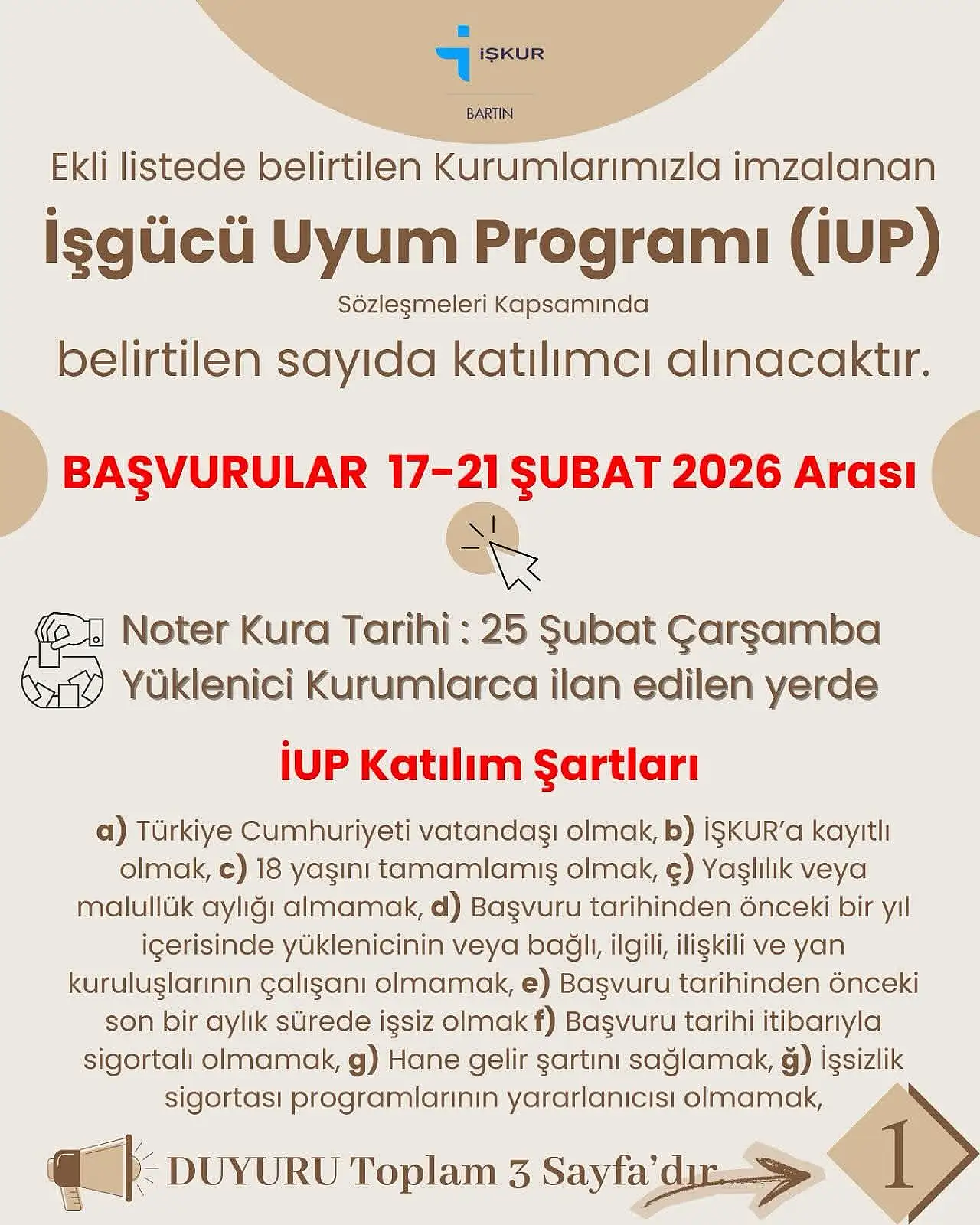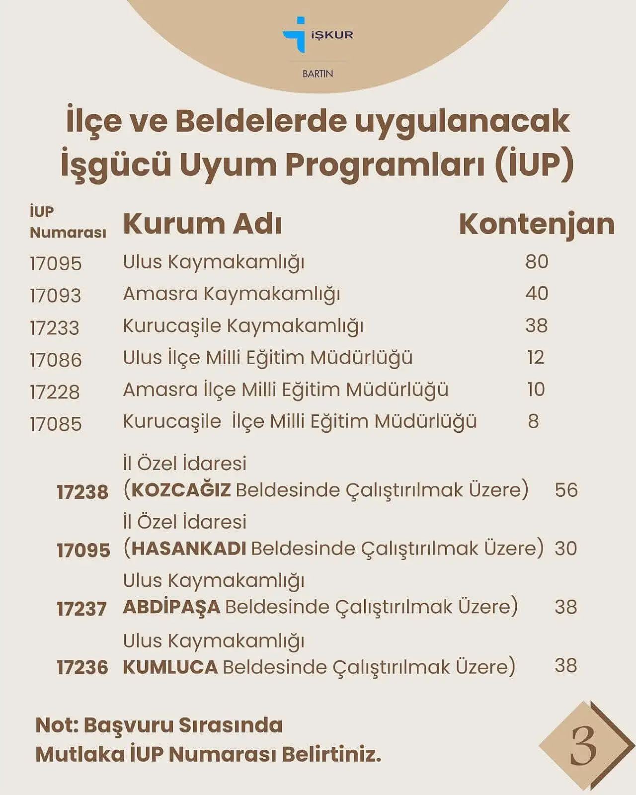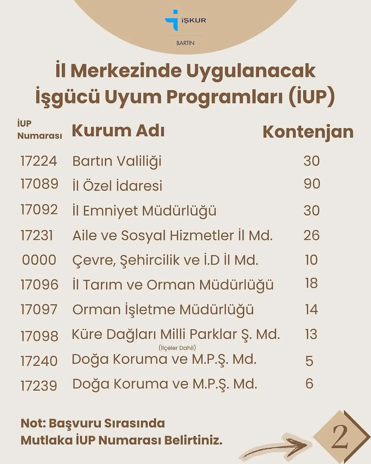 Türkiye İş Kurumu (İŞKUR) Bartın İl Müdürlüğü, kamu kurumları ile imzalanan protokoller çerçevesinde yüzlerce kişiye iş imkanı sağlayacak yeni İşgücü Uyum Programlarını (İUP) ilan etti.