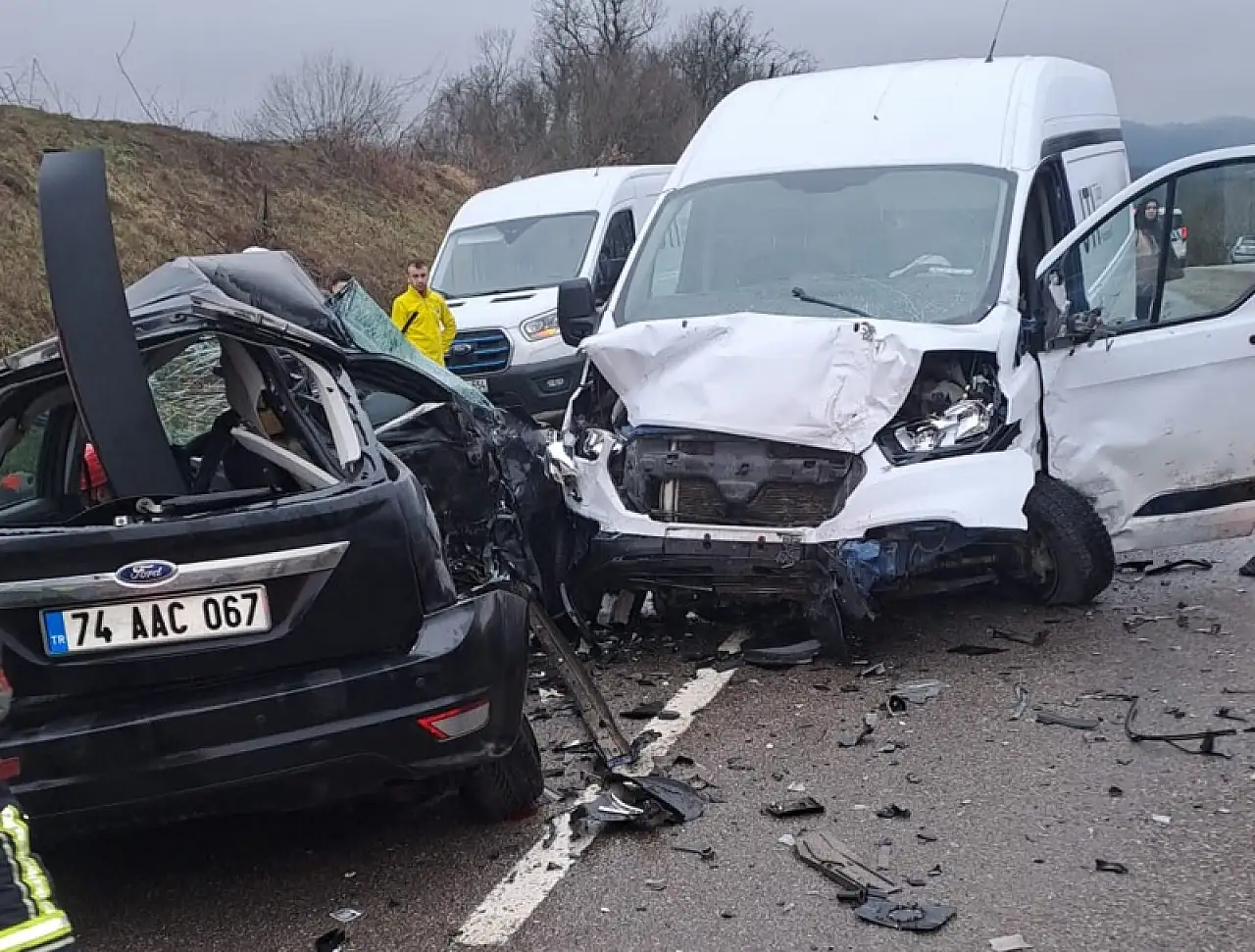 Bartın-Çaycuma karayolu Akmanlar mevkiinde meydana gelen trafik kazasında, otomobil ile kapalı kasa kamyonet kafa kafaya çarpıştı.