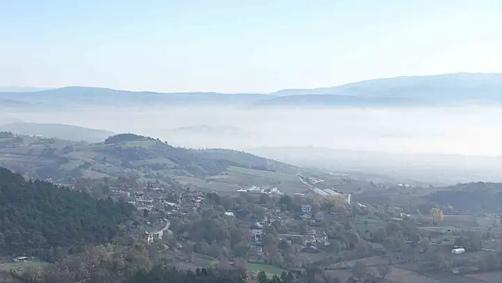 Bolu'da sabah saatlerinde etkili olan yoğun sis, şehir merkezini tamamen kaplarken, yüksek noktalardan bakıldığında bulutların üzerinde kalmış bir şehir manzarası oluştu. Havadan dron ile kaydedilen görüntülerde, sis tabakasının arasında kalan binalar ve ormanlar kartpostallık kareler oluşturdu.