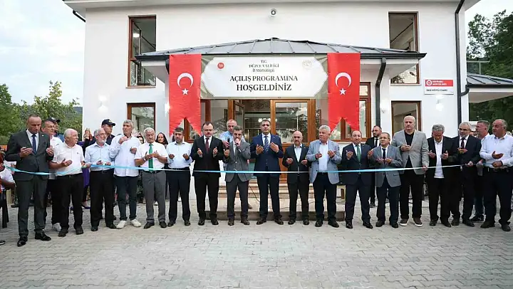 Düzce'de 23 Kasım 2022'de meydana gelen depremde ağır hasar alan ve yıkılan Saz Köyü Cami'nin yerine yenisi yapılarak ibadete açıldı.
