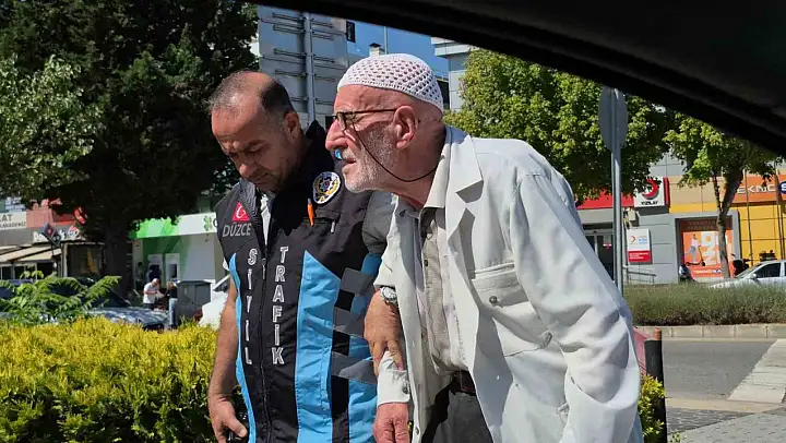 Düzce'de görevli trafik polisi, yaşlı adama yaptığı yardımla yürekleri ısıttı. Yaşlı adam, otomobil ile valilik makam girişinden girmek istedi.