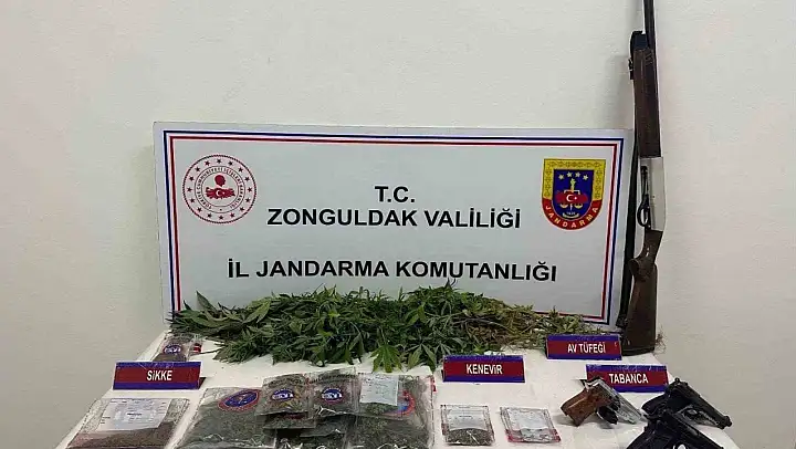 Zonguldak İl Jandarma Komutanlığı ekiplerince, Narkotik Suçlarla Mücadele kapsamında, Alaplı ilçesinde operasyon düzenlendi. Operasyonda 308 gram kubar esrar, 35 gram kenevir tohumu, 27 Gram bonzai, 14 kök kenevir bitkisi, 6 adet sentetik ecza hap, 2 adet uyuşturucu madde kullanma aparatı, 2 adet ruhsatsız tabanca, 1 adet kuru sıkı tabanca, 18 adet 9 mm tabanca fişeği, 15 adet 9 mm kurusıkı tabanca fişeği, 16 adet sikke, 1 adet av tüfeği, 2 adet cep telefonu ele geçirildi. Olayla ilgili yakalanan 2 şüpheli sevk edildikleri adli makamlarca adli kontrol şartıyla serbest bırakıldı.