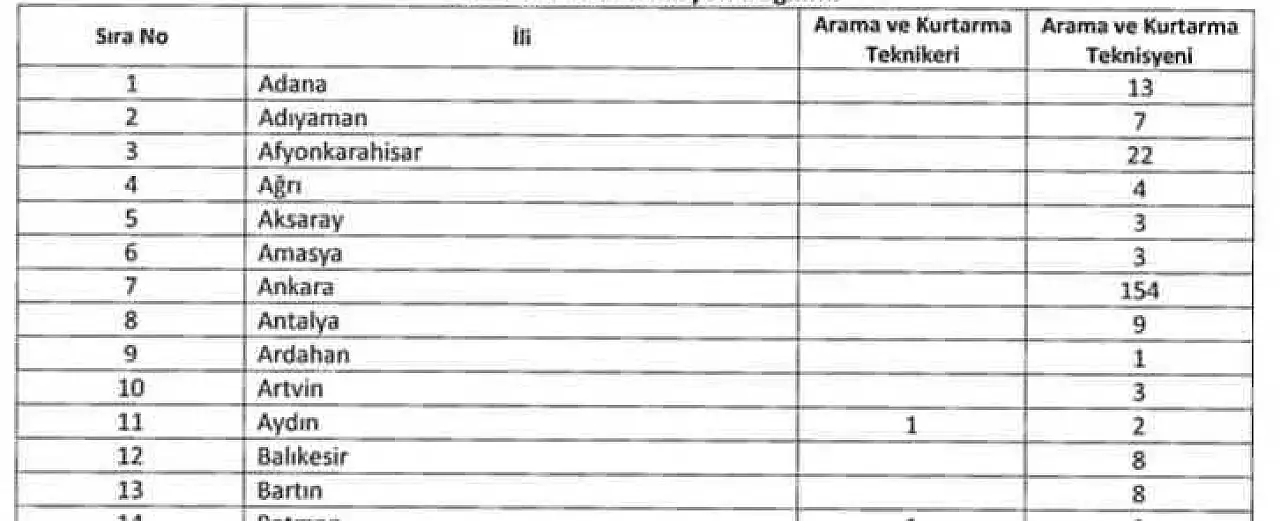Afet ve Acil Durum Yönetimi Başkanlığı taşra teşkilatında çalıştırılmak üzere 77 adet sözleşmeli arama ve kurtarma teknikeri ile 1.173 adet sözleşmeli arama ve kurtarma teknisyeni alımı yapılacak.