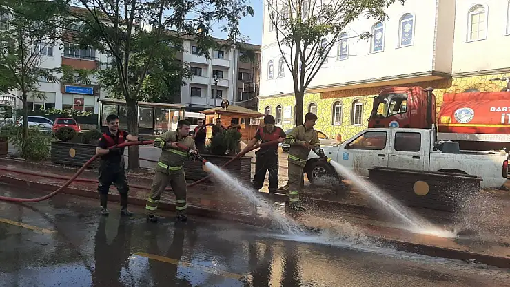Su baskını yaşayan binalarda tahliye çalışmaları yapan Bartın Belediyesi ekipleri bir yandan da cadde ve sokaklarda yol yıkama çalışmaları gerçekleştiriyor. İtfaiye Müdürlüğü ve Temizlik İşleri Müdürlüğü tarafından yürütülen çalışmalar kapsamında son olarak Cumhuriyet Mahallesi, Aladağ Mahallesi yol ve kaldırımları tazyikli su ile yıkandı.