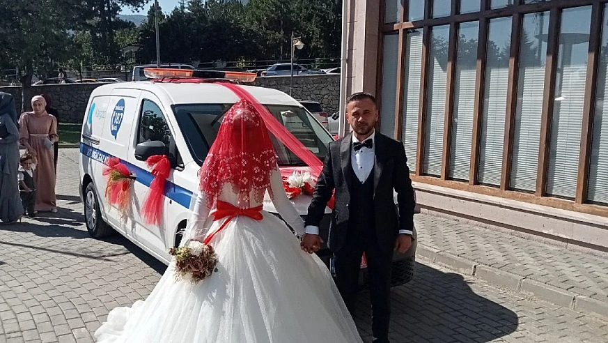 Karabük'te doğalgaz firmasında çalışan damat, düğün arabasını da firmadaki araçtan yaparak, gelin almaya gitti.