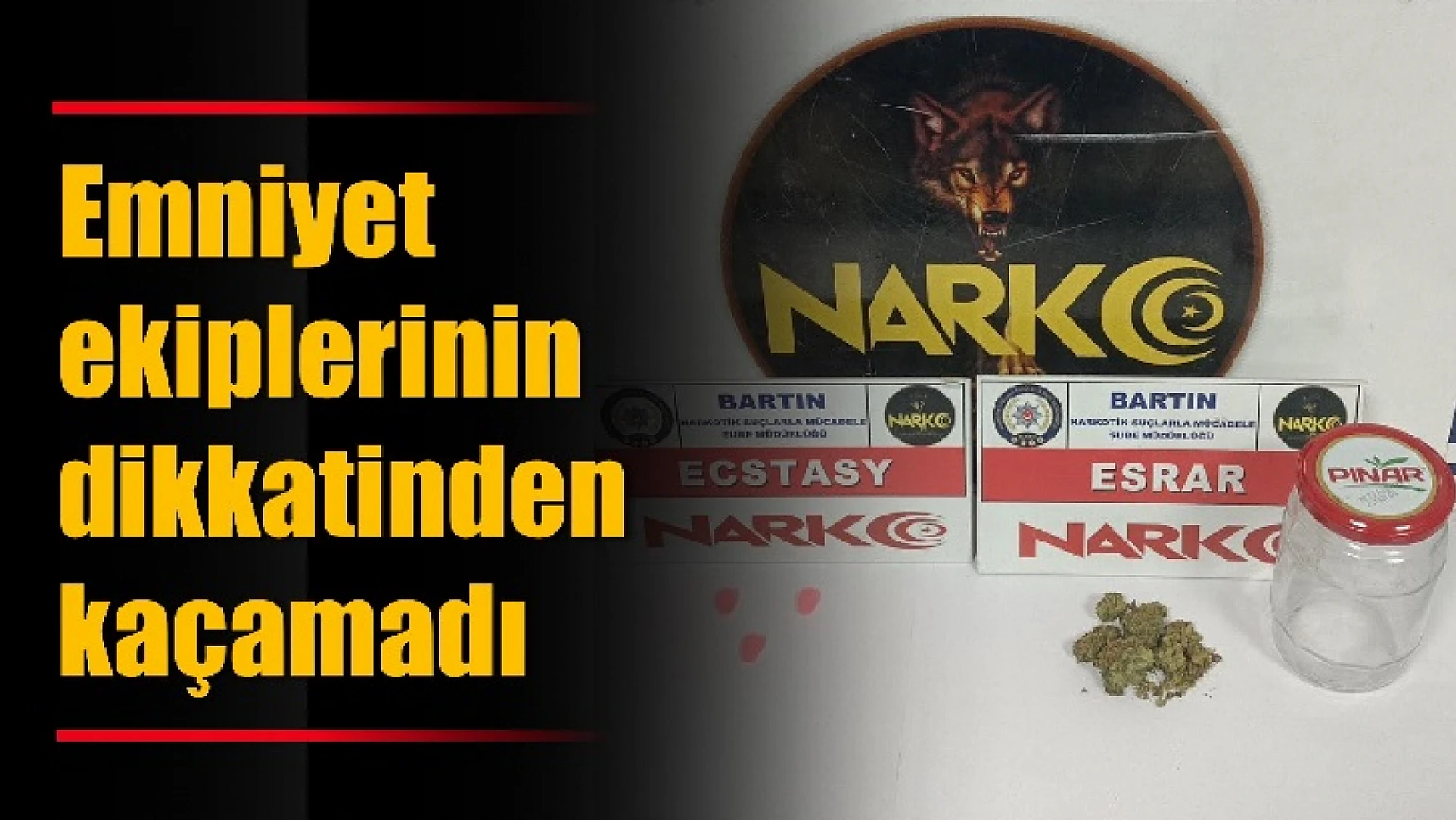 Emniyet ekiplerinin durdurduğu şahsın üzerinde yapılan aramada esrar maddesi ve ecstasy hap ele geçirildi.