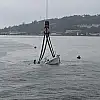 Fırtınada batan mini yat vinç yardımıyla karaya çıkarıldı