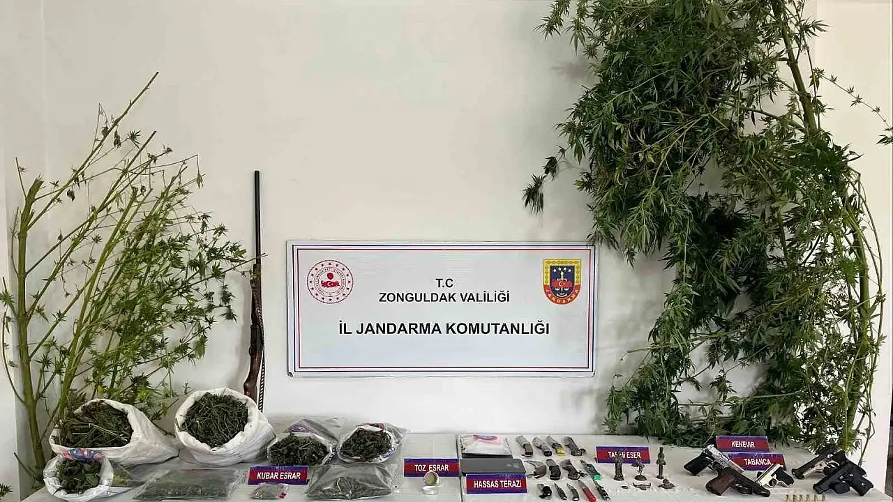 Belirlenen 6 adrese eş zamanlı olarak yapılan aramalarda; 2 kilo 864 gram kubar esrar, 16 gram toz esrar, 2 kök kenevir bitkisi, 1 adet hassas terazi ve 96 adet kilitli poşet ele geçirildi. Operasyonda ayrıca 5 adet kurusıkı tabanca, 1 adet av tüfeği, tarihi eser niteliğinde olduğu değerlendirilen 5 obje, 1 adet sikke ile 12 adet bıçak ve kama bulundu.