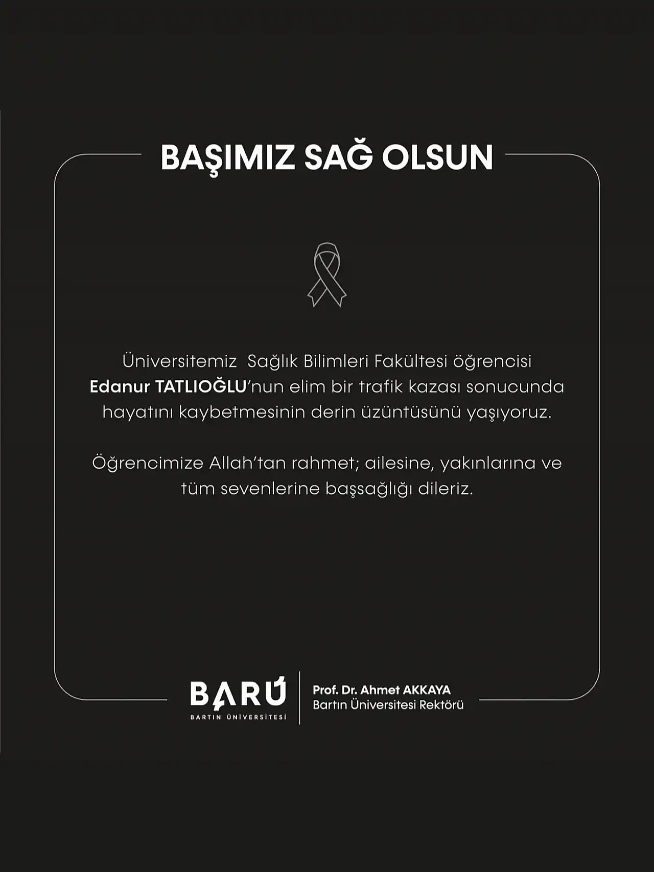 Bartın'da meydana gelen trafik kazasında servis durağına yürürken otomobilin çarptığı üniversite öğrencisi Edanur Tatlıoğlu'nun yaşamını kaybetmesinin ardından Bartın Üniversitesi Rektörü Prof. Dr. Ahmet Akkaya başsağlığı mesajı yayınlandı.
