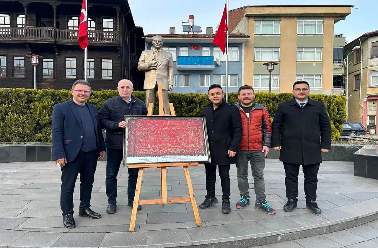 Okcu, sancakla ilgili yaptığı açıklamada, “1906 yılında, bundan tam 119 yıl önce ayetler, sureler ve padişah tuğrası tek tek elde işlenerek hazırlanmıştır. Altın sarısı tel sarma sanatıyla kırmızı ipek üzerine yapılan bu eser, Hasan Dede Camii-i Şerifi’nde mihrabın yanında, ay yıldızlı ahşap direğinde muhafaza edilmiştir. Boyu 2,27 metre, eni 1,27 metre olan sancak, büyük ve heybetli bir eserdir” dedi.