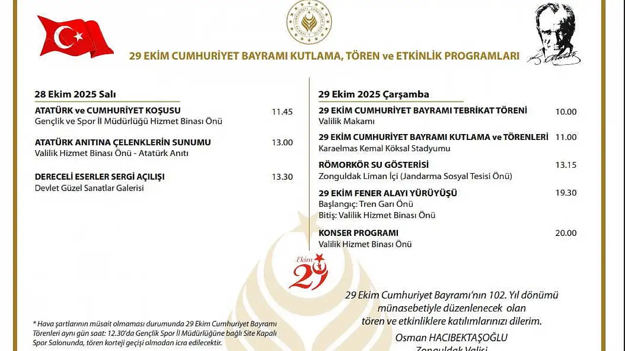 Cumhuriyetin 102. yılı kapsamında kentte yapılacak kutlama, tören ve etkinlik programı Zonguldak Valiliği tarafından duyuruldu.